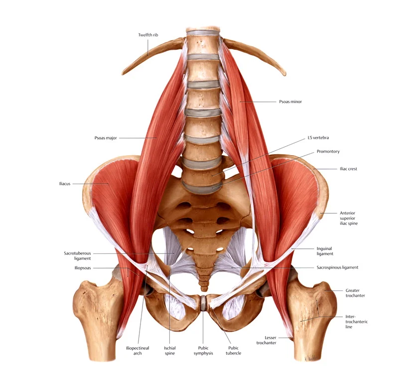 Within our deepest core lie three long complex muscles that stretch along both sides of the spine, span laterally from the 12th thoracic vertebra (T12) to each of the 5 lumbar vertebra and flow down through the abdominal core, the pelvis, to attach to the top of the femur (thigh) bone